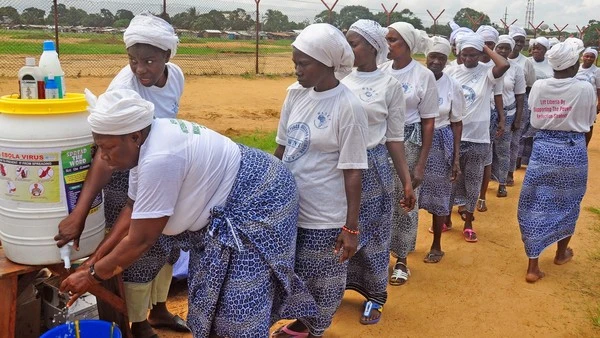 Người dân xếp hàng để rửa tay bằng nước khử trùng phòng chống Ebola lây lan.
