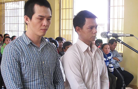 Hai cựu công an viên xã Vạn Long (Vạn Ninh, Khánh Hòa) Lê Minh Phát (trái) và Lê Ngọc Tâm tại phiên tòa sơ thẩm lần 1. Ảnh: TẤN LỘC
