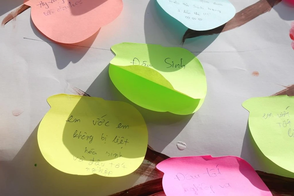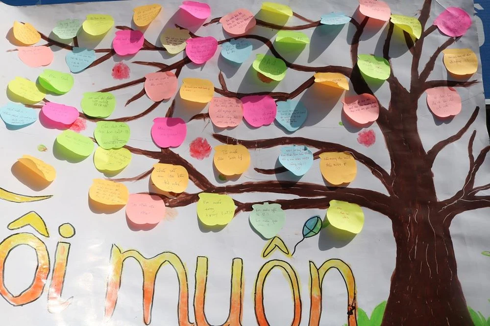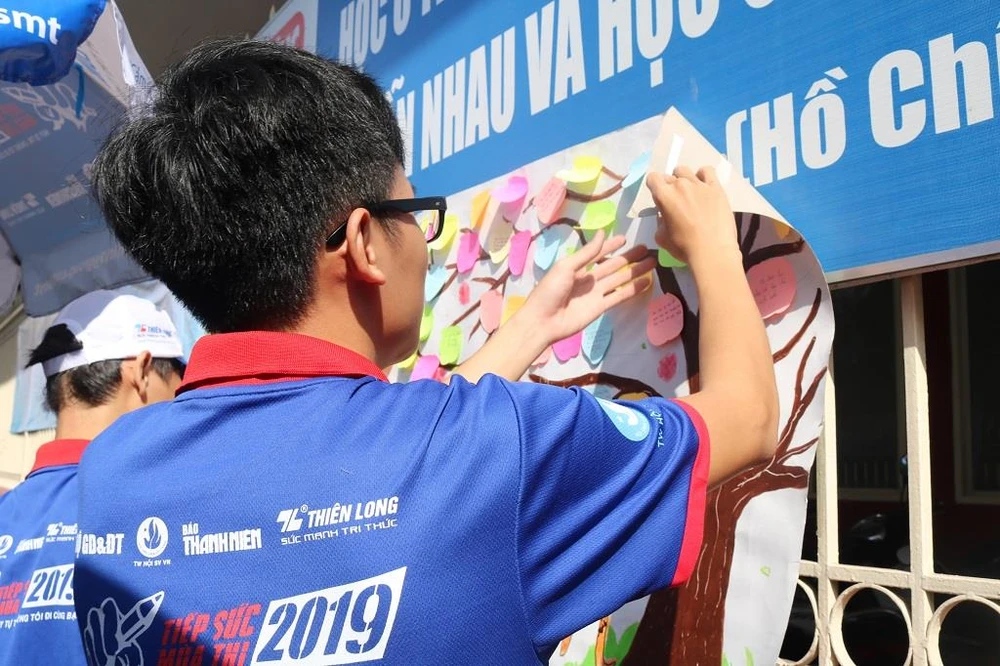Nổi bật tại điểm thi trường THCS Colette (quận 3) là tấm bảng “Tôi muốn” của đội hình trường Tiếp sức mùa thi ĐH Y Dược TP.HCM để thí sinh viết lên ước muốn của mình với ý tưởng lá cây thể hiện ước muốn của thí sinh.