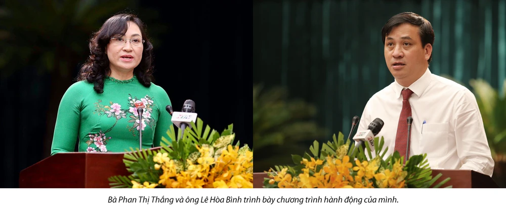 Tuy nhiên, trước khi được bầu vào cương vị mới, bà Phan Thị Thắng và ông Lê Hòa Bình đều có chương trình hành động của mình. Trong đó nêu bật những việc làm cụ thể trong thời gian tới và cam kết với các đại biểu sẽ thực hiện nhiều vấn đề cho sự phát triển của TP.HCM.