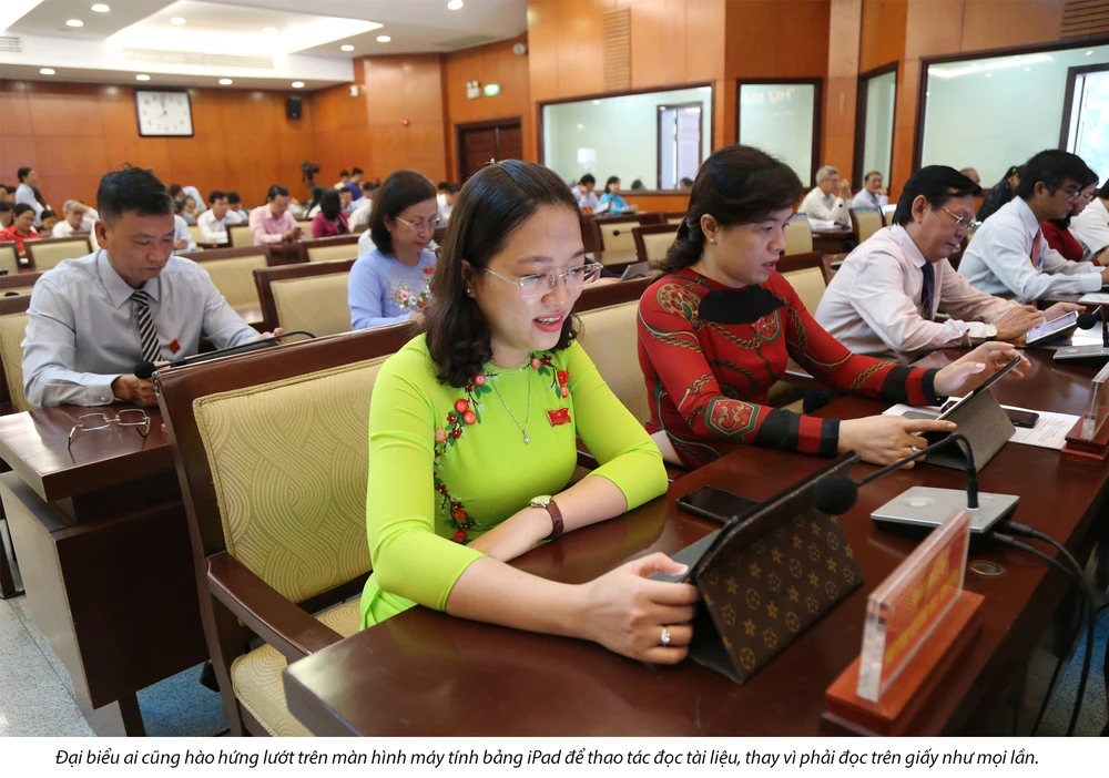 Sáng 11-7-2019 có lẽ là một buổi sáng đặc biệt của các đại biểu bởi lần đầu tiên tại kỳ họp thứ 15 HĐND TP.HCM khóa IX đã triển khai ứng dụng “kỳ họp không giấy” vào nghị trường.