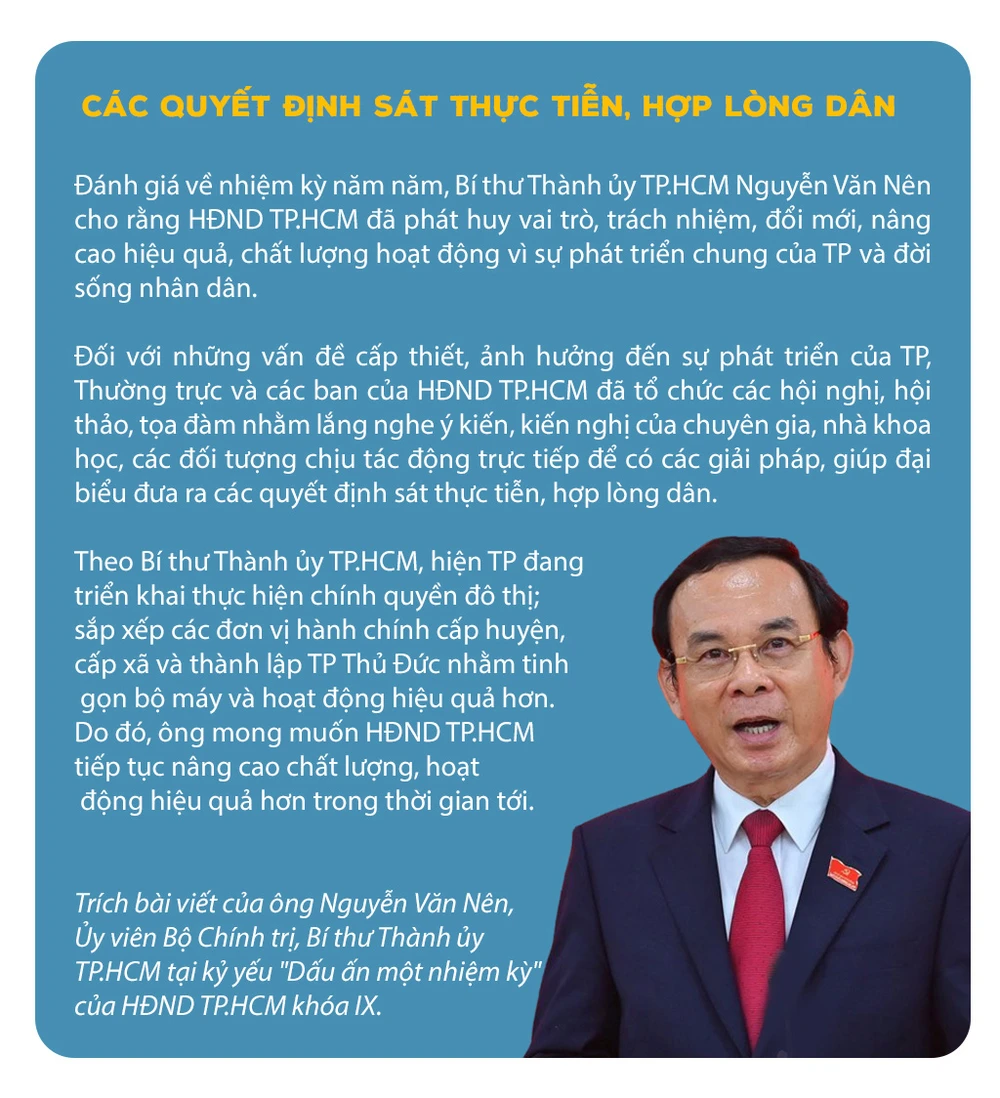 Chẳng hạn, HĐND TP.HCM đã cụ thể hóa việc xây dựng chính quyền đô thị trên địa bàn TP, góp phần hình thành và đưa TP Thủ Đức đi vào hoạt động; quyết định chủ trương đầu tư các dự án đầu tư công; ưu đãi bổ sung cho dự án đầu tư mở rộng của Tập đoàn điện tử Samsung tại Khu Công nghệ cao TP.HCM.