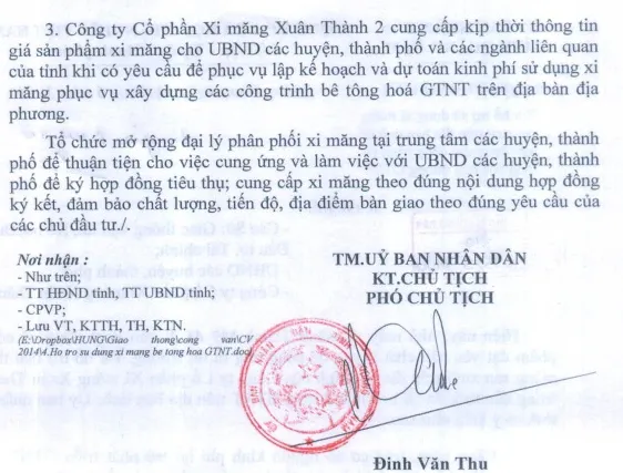 Công văn này cũng yêu cầu Công ty Cổ phần Xi măng Xuân Thành 2 tổ chức mở rộng đại lý phân phối xi măng tại trung tâm các huyện, TP để thuận tiện cho việc cung ứng và làm việc với UBND các huyện, TP để ký hợp đồng tiêu thụ…