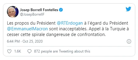 "Bình luận của ông Erdogan về ông Macron là không thể chấp nhận được. Chúng tôi kêu gọi Thổ Nhĩ Kỳ chấm dứt vòng xoáy đối đầu nguy hiểm này" - ông Borrell đăng tải dòng trạng thái trên trang Twitter cá nhân của mình.