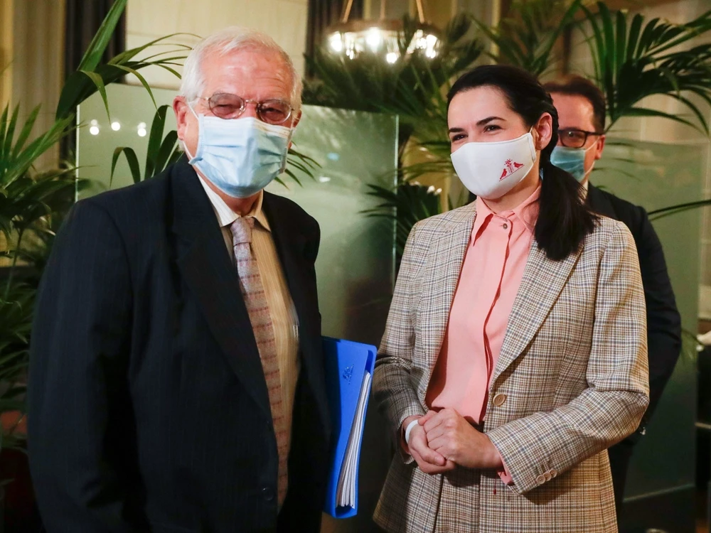 Thủ lĩnh phe đối lập Belarus Svetlana Tikhanovskaya (phải) và Đại diện cấp cao về an ninh và chính sách đối ngoại EU Josep Borrell (trái). Ảnh: REUTERS