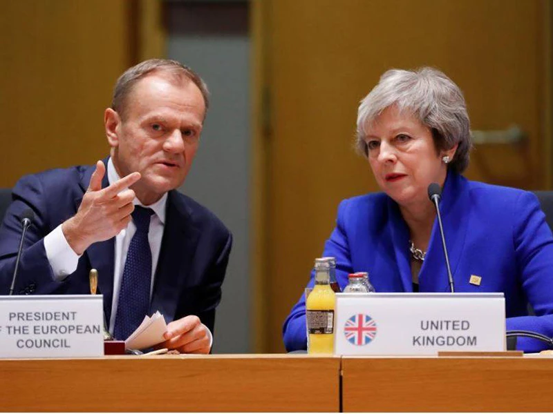 Thủ tướng Anh Theresa May (phải) và Chủ tịch Hội đồng Liên minh châu Âu (EU) Donald Tusk trong phiên họp bất thường các lãnh đạo EU nhằm thống nhất thỏa thuận Brexit, tại Brussels (Bỉ) ngày 25-11. Ảnh: REUtERS