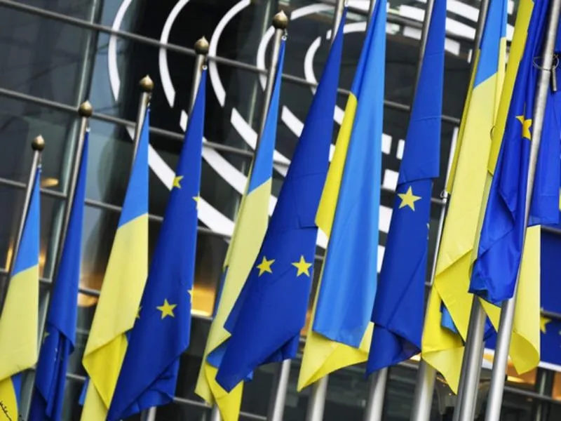 Quốc kỳ Ukraine và cờ Liên minh châu Âu (EU) tại Brussels, Bỉ, ngày 1-3. Ảnh: AP