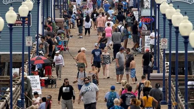 Rất ít người Mỹ đeo khẩu trang khi đi bộ trên bến tàu ở California ngày 22-6-2020. Ảnh: REUTERS