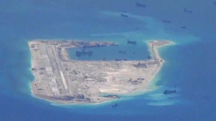 Ngày 21-5, máy bay trinh sát P-8 của Mỹ chụp được hình ảnh các tàu vét bùn của Trung Quốc bồi đắp đất mới cho "đảo" Chữ Thập (Ảnh: Reuters)