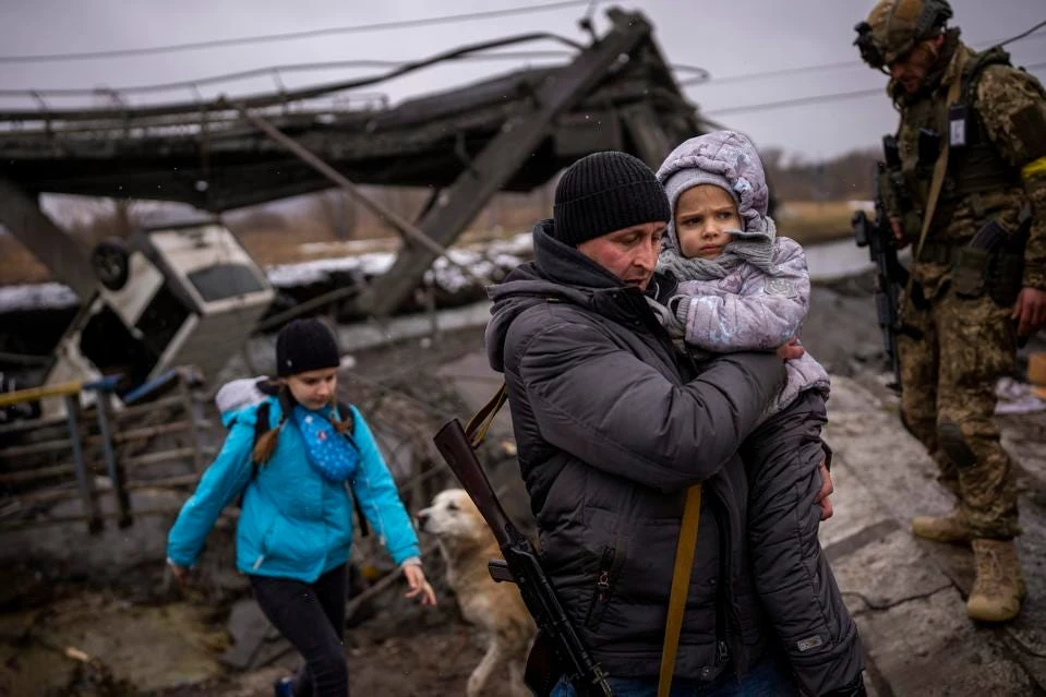 Một gia đình đang chạy trốn qua cây cầu bị pháo kích ở ngoại ô Kiev, Ukraine, ngày 2-3. Ảnh: AP