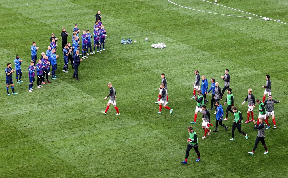 Hình ảnh ấn tượng và đẹp khi các cầu thủ Phần Lan vỗ tay chào đón sự trở lại của các cầu thủ Đan Mạch sau sự cố Eriksen. Ảnh: UEFA