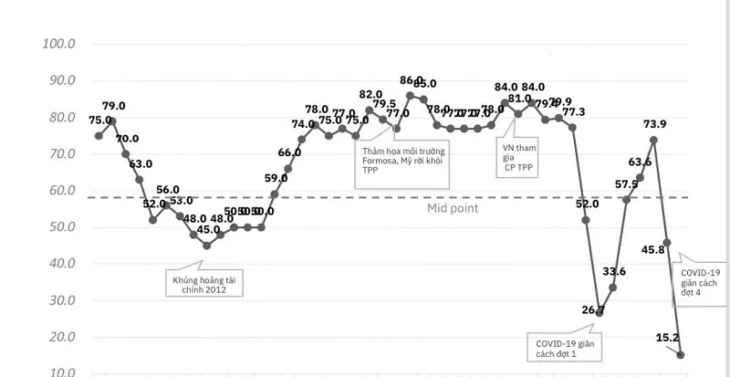 Chỉ số môi trường kinh doanh (BCI) đạt 15,2 điểm, mức thấp nhất trong 10 năm qua. Đây là kết quả khảo sát BCI trong thời gian phong toả, giãn cách xã hội do Hiệp hội Doanh nghiệp châu Âu tại Việt Nam (Eurocham) tiến hành từ 2.000 doanh nghiệp (DN) thành viên.
