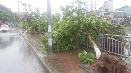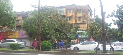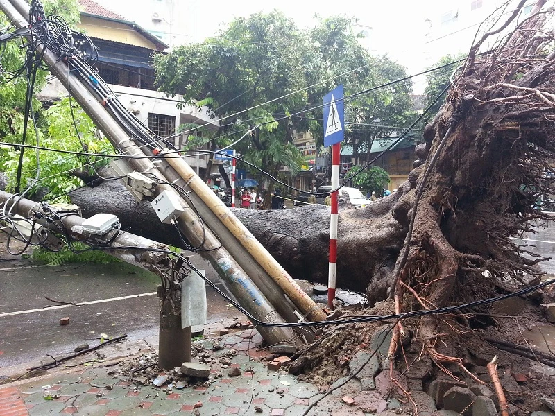 Gió giật cấp 8-10 khiến hàng loạt cây xanh trên các tuyến phố Hà Nội bị bật gốc ảnh hưởng đến hệ thống lưới điện. Ảnh: Trà Phương