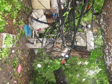 Bão số 1 đã gây ra mưa to, gió lớn tại Hà Nội làm nhiều cột điện bị nghiêng, gãy đổ. Ảnh: HVC