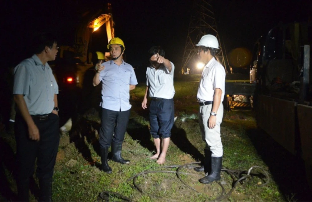 Phó Tổng giám đốc EVN Ngô Sơn Hải (người đội mũ bảo hộ màu vàng) chỉ đạo xử lý sự cố đường dây 220 kV Vũng Áng - Ba Đồn - Đồng Hới trong đêm 15 rạng sáng 16-9.