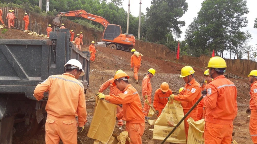 Nhân viên Tổng công ty Điện lực miền Bắc diễn tập phòng chống bão lụt vào tháng 7-2017.