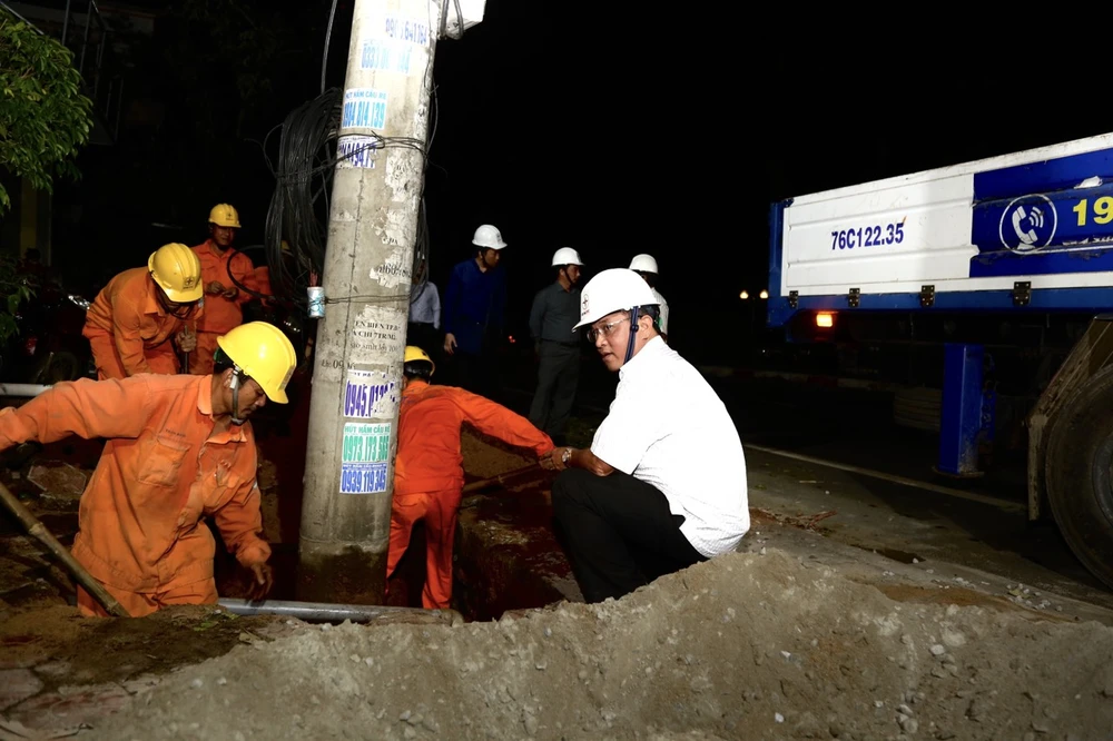 Tổng giám đốc EVNCPC Ngô Tấn Cư (áo trắng) chỉ đạo khắc phục hậu quả bão số 9 năm 2020 tại Quảng Ngãi.