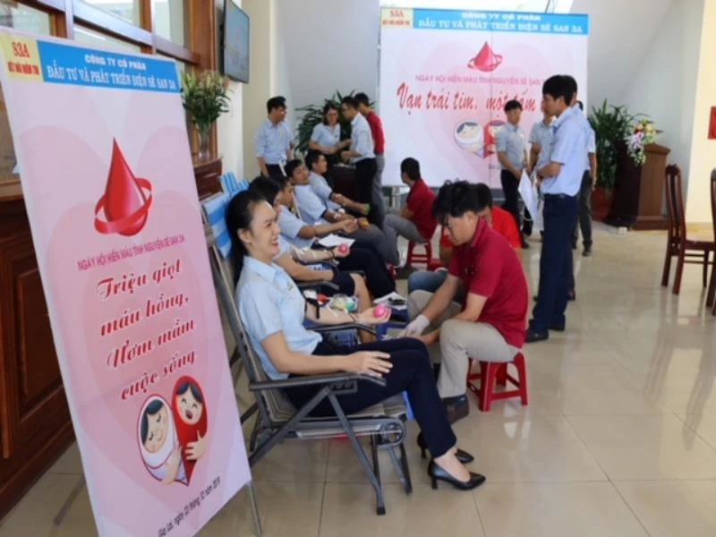 Cán bộ, nhân viên Công ty cổ phần Đầu tư và phát triển điện Sêsan 3A tham gia hiến máu. Ảnh: ĐT