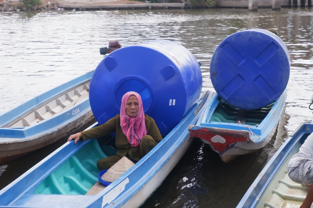 Nhận được bồn chứa nước, bà Hai Cúc ở xã Trần Phán xúc động: “Khi cán bộ xã cho hay gia đình tôi được nhận bồn đợt này, vợ chồng tôi mừng lắm. Nhà có hai ông bà già, tiền ăn uống còn không đủ nữa nên đâu có điều kiện để mua bồn này. Giờ thì có cái bồn để chứa nước ngọt rồi, không lo thiếu nước để uống nữa”.