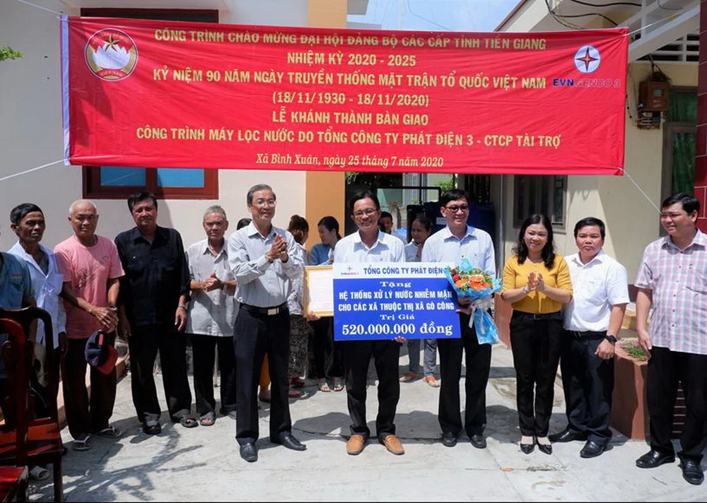 Chung tay cùng các địa phương hỗ trợ người dân Đồng bằng Sông Cửu Long vượt qua khó khăn trong đợt hạn mặn khốc liệt và giúp bà con có điều kiện sử dụng nước ngọt lâu dài, Tổng Công ty Phát điện 3 (EVNGENCO 3) phối hợp Ủy ban MTTQVN tỉnh Tiền Giang, thị xã Gò Công tổ chức lễ bàn giao 2 hệ thống lọc nước nhiễm mặn thành nước ngọt cho chính quyền, người dân địa phương 2 xã Bình Đông và Bình Xuân, thị xã Gò Công.
