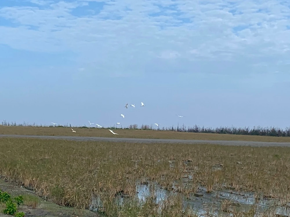 Đàn cò kéo nhau về trên bãi thải xỉ dự án nhiệt điện Duyên Hải (Trà Vinh).