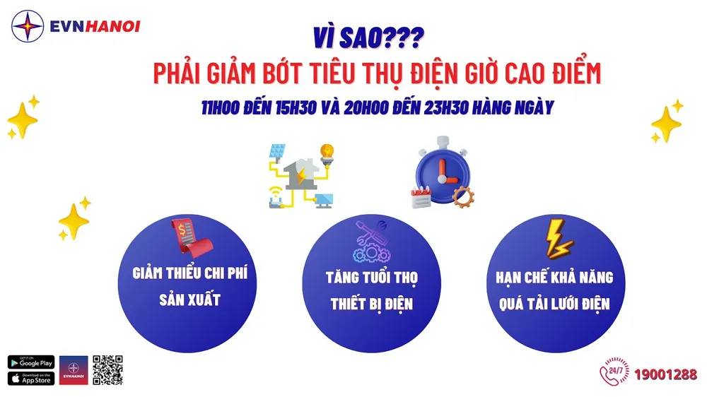 Chính vì vậy, Tổng Công ty Điện lực TP Hà Nội (EVNHANOI) khuyến nghị khách hàng: Hãy sử dụng điện tiết kiệm, hiệu quả, tắt bớt các thiết bị điện không cần thiết, hạn chế sử dụng các thiết bị tiêu thụ nhiều điện trong giờ cao điểm của hệ thống điện (bao gồm khung giờ từ 11 giờ đến 15 giờ 30 phút và từ 20 giờ đến 23 giờ 30 phút hàng ngày).