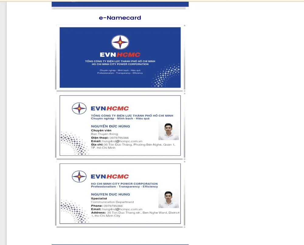 Ứng dụng e-Namecard được trích xuất hoàn toàn tự động từ cơ sở dữ liệu quản lý nhân sự trên HRMS và xác thực thông tin thông qua website của EVNHCMC tại địa chỉ http://www.evnhcmc.vn, giúp khách hàng nhanh chóng xác định chính danh nhân viên điện lực khi giao tiếp, tránh tình trạng giả mạo nhân viên điện lực lừa đảo khách hàng.