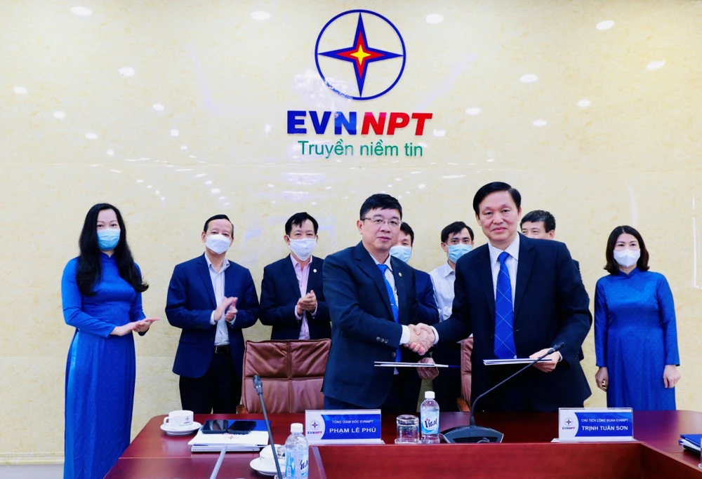 Ông Phạm Lê Phú - Tổng giám đốc EVNNPT và ông Trịnh Tuấn Sơn - Chủ tịch Công đoàn EVNNPT ký biên bản đánh giá Quy chế phối hợp và Quy chế thực hiện dân chủ cơ sở tại nơi làm việc của EVNNPT.