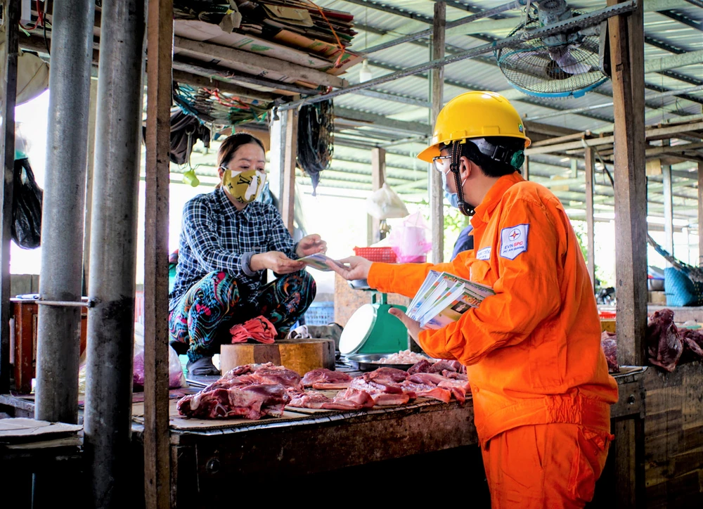 Tuyên truyền sử dụng điện an toàn, tiết kiệm tại một khu chợ ở thành phố Châu Đốc trong mùa dịch.