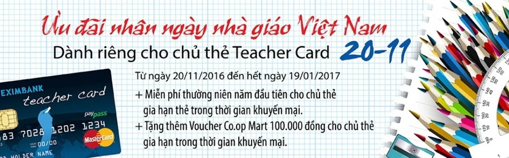 Eximbank - Teacher Card Paypass là phương tiện thanh toán hiện đại không dùng tiền mặt, được chấp nhận thanh toán hàng hóa, dịch vụ, thanh toán trực tuyến, rút tiền mặt tại các điểm giao dịch, website, ATM có biểu tượng MasterCard trên toàn cầu. Sử dụng thẻ, khách hàng được sử dụng nguồn vốn do ngân hàng ứng trước với thời gian miễn lãi lên đến 45 ngày. Song song đó là nhiều ưu đãi khác như tham gia chương trình “Tích lũy điểm thưởng” để đổi quà tặng hoặc tiền vào tài khoản; giảm giá lên đến 50% tại các hệ thống siêu thị, nhà hàng, khách sạn, khu nghỉ mát, phòng khám đa khoa…; nhận quà nhân ngày 20-11; định kỳ tham gia các chương trình ưu đãi của Eximbank. Ngoài ra, từ ngày 20-11-2016 đến 19-1-2017, thầy cô còn được miễn phí thường niên, tặng thêm voucher Co.opmart trị giá 100.000 đồng khi gia hạn thẻ, cùng nhiều chương trình hấp dẫn khác.