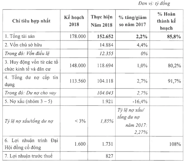 Tỷ lệ nợ xấu nội bảng mục tiêu dưới 2%. Kế hoạch lợi nhuận trước thuế trích bổ sung dự phòng trái phiếu VAMC là 2.000 tỷ, lợi nhuận trước thuế đạt 1.077 tỷ đồng, tăng 30%.
