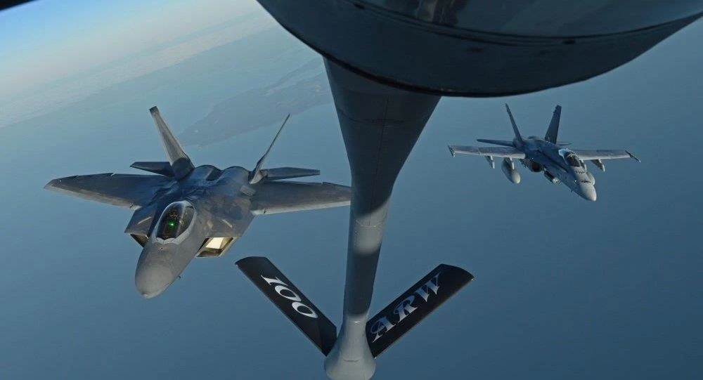 Chiếc F-22 của Mỹ và chiếc F/A-18 Hornet của Phần Lan bay sau máy bay tiếp nhiên liệu KC-135 Stratotanker của Mỹ trong một cuộc diễn tập năm 2018. Ảnh: SPUTNIK
