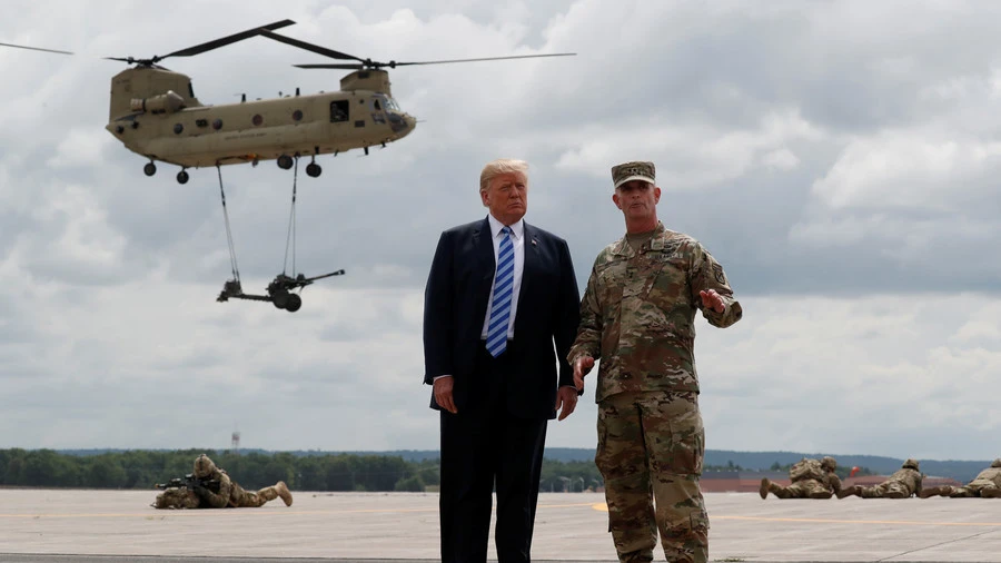 Tổng thống Mỹ Donald Trump và Thiếu tướng Walter Piatt tại Fort Drum, New York ngày 13-8. Ảnh: REUTERS