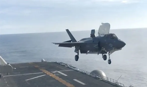 F-35 của Mỹ hạ cánh thẳng đứng trên tàu sân bay USS America. Ảnh: EXPRESS