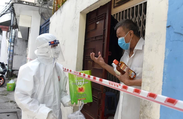 Nhân viên y tế phát túi thuốc cho F0 tại nhà. Ảnh: HCDC