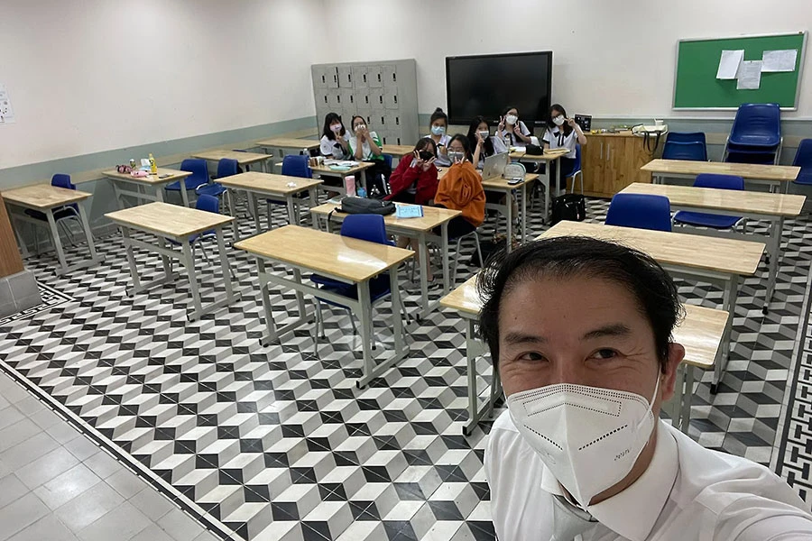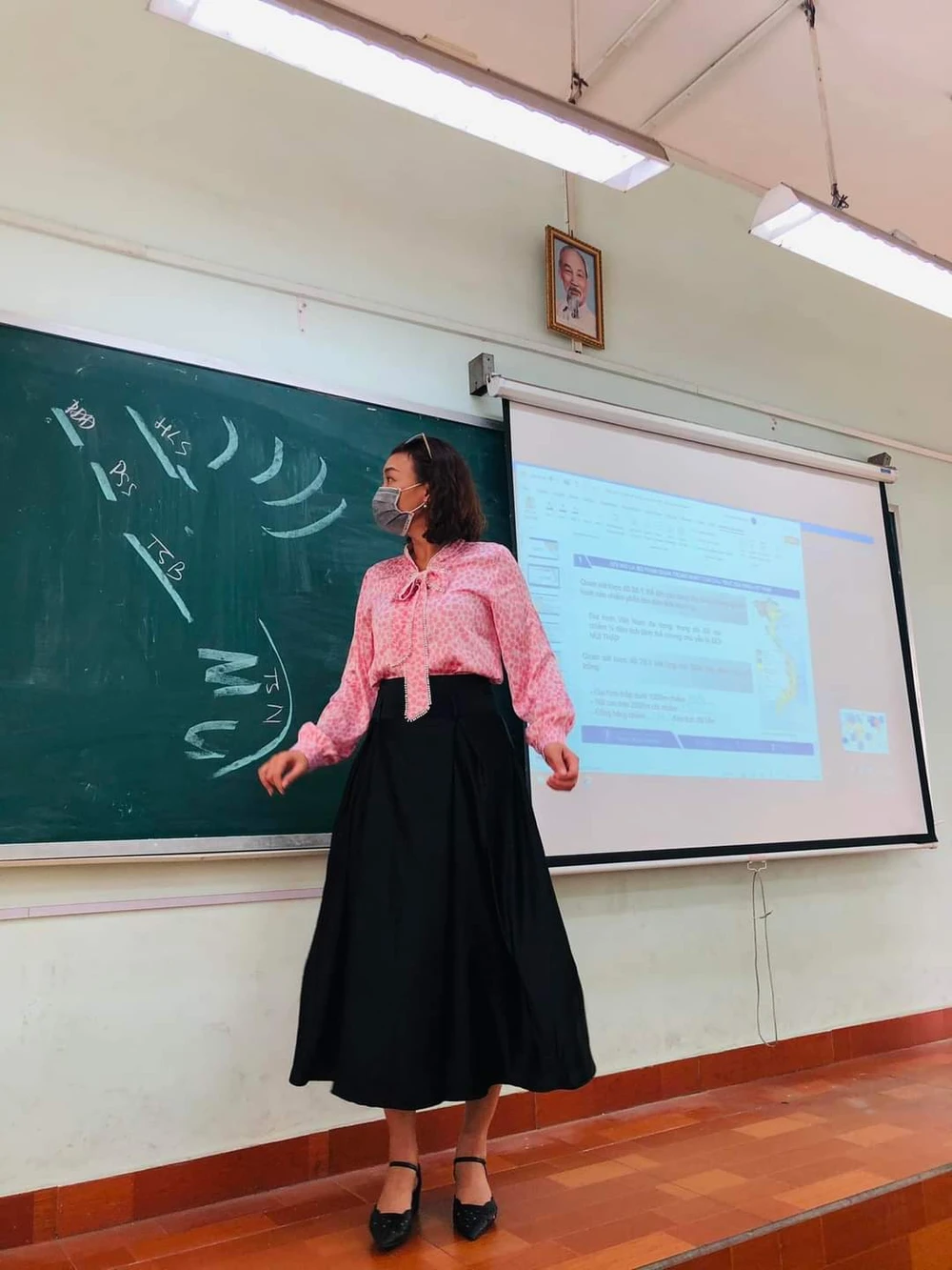 Cô Hiệp trở lại trường dạy trực tiếp, sau thời gian bị COVID, ở nhà vừa điều trị vừa dạy trực tuyến. Ảnh: NVCC