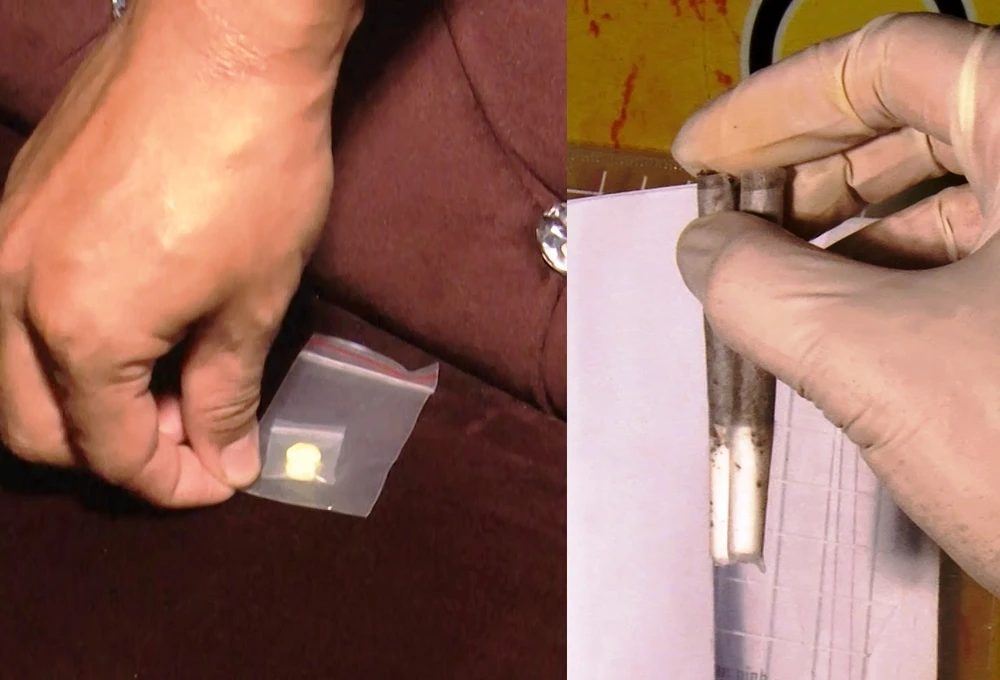 Ma túy nhét dưới ghế và vứt xuống sàn nhà. Ảnh: CA