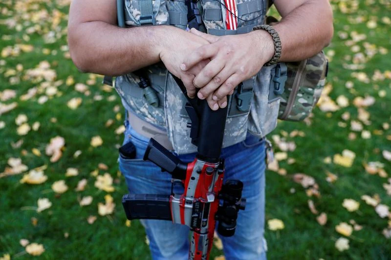 Một người đàn ông đứng cầm súng trong khi những người ủng hộ Tổng thống Mỹ Donald Trump biểu tình bên ngoài tòa nhà Quốc hội hôm 7-11-2020. Ảnh: REUTERS
