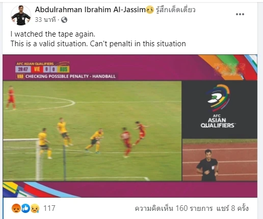 Trong khi ngày hôm qua (8-9), báo chí Thái Lan cũng đăng giao diện trang xã hội facebook của trọng tài Abdulrahman lời khẳng định của chính trọng tài này là “Tôi đã xem lại băng hình, tôi không bắt phạt đền tình huống này.”