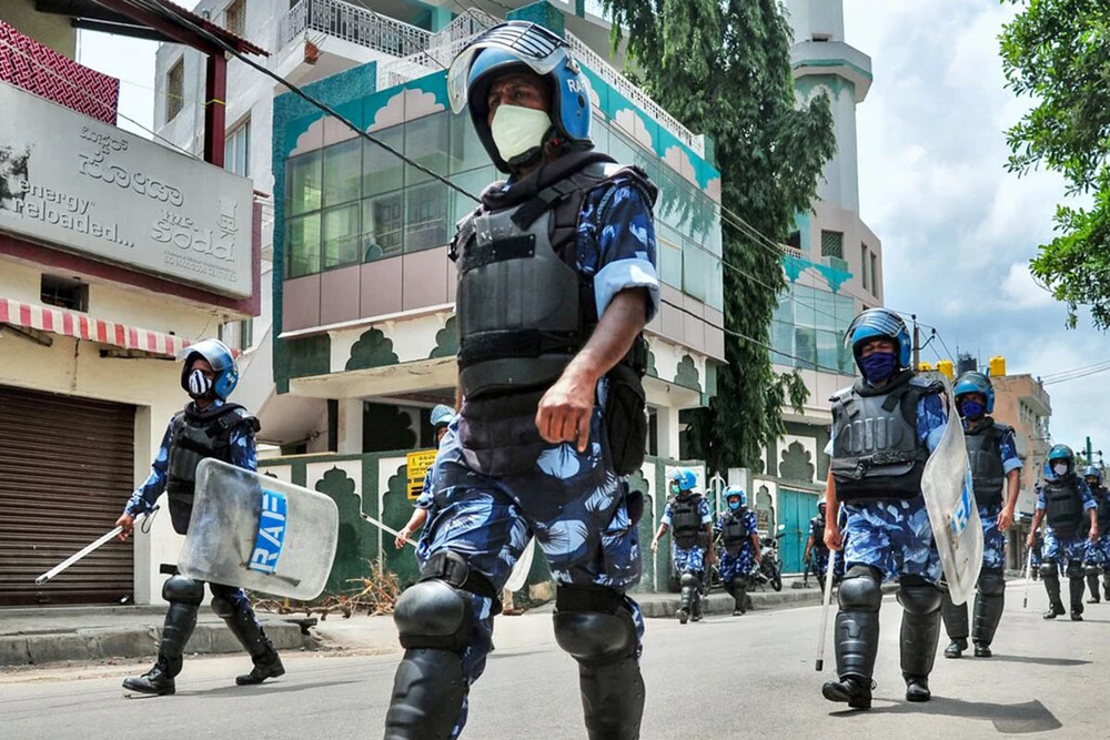Lực lượng phản ứng nhanh tuần tra đường phố TP Bangalore, bang Karnataka (Ấn Độ) hồi tháng 8-2020 sau khi trên Facebook xuất hiện một bài đăng kích động bạo loạn. Ảnh: AFP
