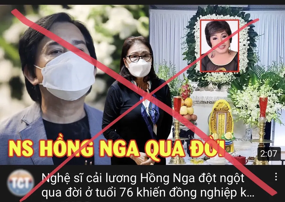 Vài ngày trước, một kênh Youtube đã đăng tải clip với thông tin: “Ca sỹ Nhật Kim Anh đột ngột qua đời ở bệnh viện”. Để tăng tính chân thật, người đăng video còn ghép ảnh nữ diễn viên nằm thở máy ở bệnh viện và cảnh các bác sĩ đứng bất lực trong phòng phẫu thuật như sự việc có thật. Chưa dừng lại, một tài khoản Youtube khác còn khiến diễn viên Hồng Nga và gia đình bức xúc khi lan truyền clip có nhan đề: “Nghệ sĩ cải lương Hồng Nga đột ngột qua đời ở tuổi 76 khiến đồng nghiệp khán giả bàng hoàng”.