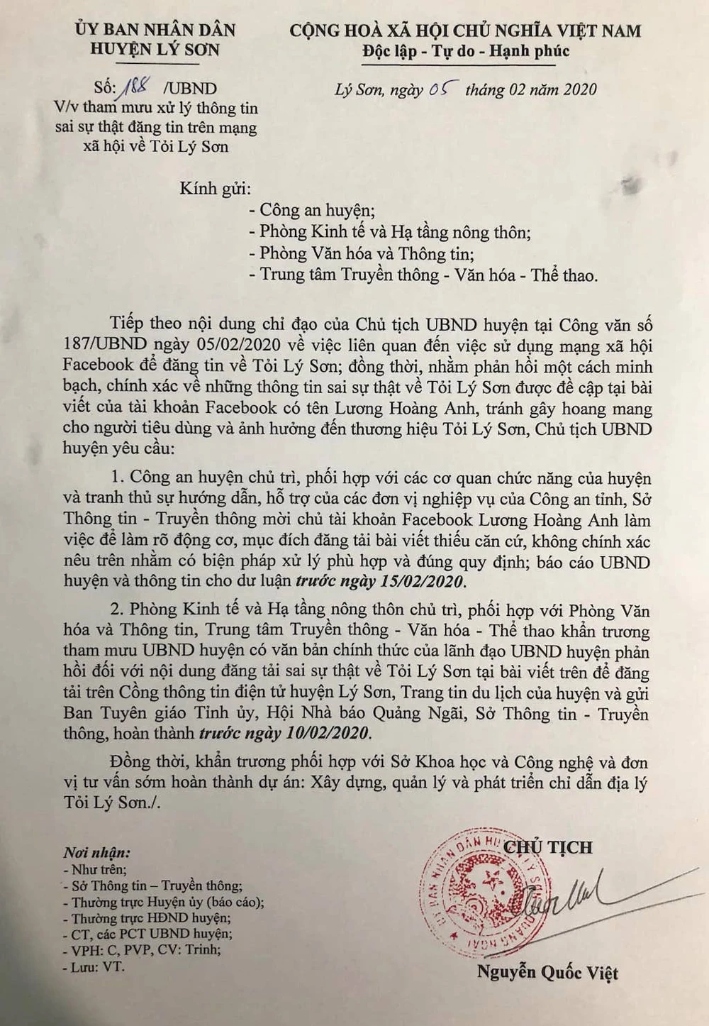 Sau khi chủ tài khoản thông tin, ngày 5-2, ông Nguyễn Quốc Việt, Chủ tịch UBND huyện đảo Lý Sơn, Quảng Ngãi, đã gửi văn bản mời chủ tài khoản Facebook Lương Hoàng Anh để làm rõ động cơ, mục đích đối với việc đăng thông tin sai sự thật về tỏi Lý Sơn.