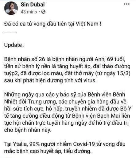 Ngoài ra, trên trang (page) Sin Dubai cũng đăng thông tin: “Đã có ca tử vong đầu tiên tại Việt Nam!” cùng với phần cập nhật: “Bệnh nhân số 26 là bệnh nhân người Anh, 69 tuổi, tiền sử bệnh lý nền là tăng huyết áp, đái tháo đường tuyp 2, đã được lọc máu, đặt thở máy (từ ngày 15-3), sau khi phát hiện dương tính với virus. Những ngày qua các y bác sĩ của Bệnh viện Bệnh nhiệt đới Trung ương, các chuyên gia hàng đầu về hồi sức tích, hô hấp, truyền nhiễm đã được Bộ Y tế tăng cường điều động từ Bệnh viện Bạch Mai liên tục hội chẩn trực tuyến hằng ngày để hỗ trợ điều trị cho bệnh nhân này. Tại Ý, 99% người nhiễm COVID-19 tử vong đều mắc bệnh cao huyết áp, tiểu đường”.