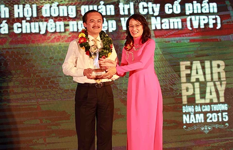 Chủ tịch HĐQT VPF Võ Quốc Thắng (trái)với danh hiệu Vinh danh Fair Play, ông cũng là người luôn đồng hành và góp ý để khu vườn bóng đá Việt Nam thêm xanh và sạch. Ảnh: XUÂN HUY