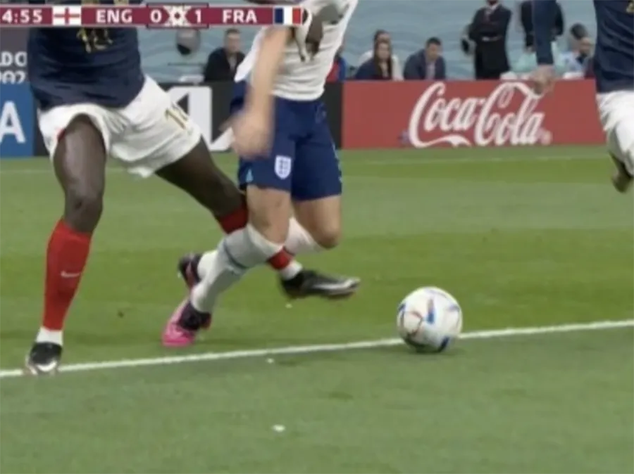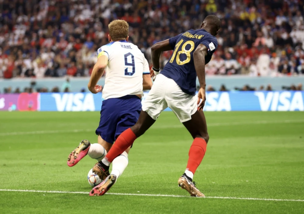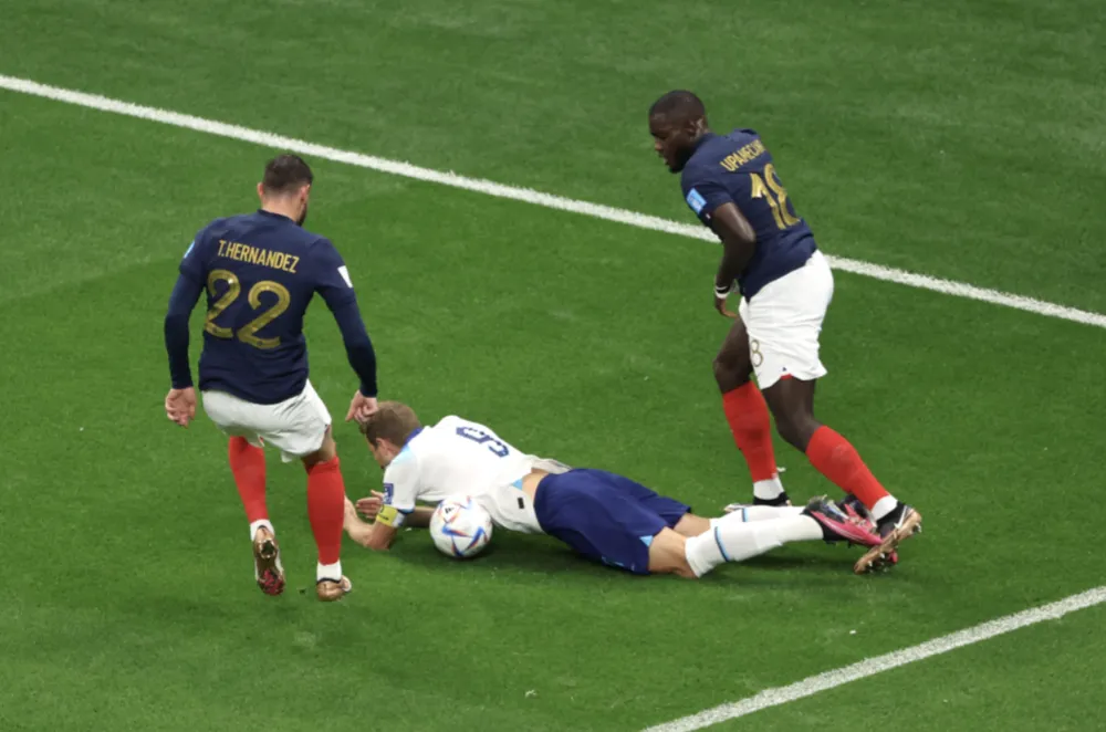 Ở pha tranh chấp giữa Kane và Upamecano, trung vệ người Pháp dường như đã cài chân đội trưởng tuyển Anh. Trước sự ngạc nhiên của Kane, trọng tài ra hiệu cho trận đấu tiếp tục trước khi VAR vào cuộc. Sau khi rời sân tiến tại màn hình xem lại tình huống, trọng tài Sampaio tiếp tục nói không pen khiến Kane choáng váng.