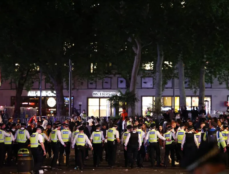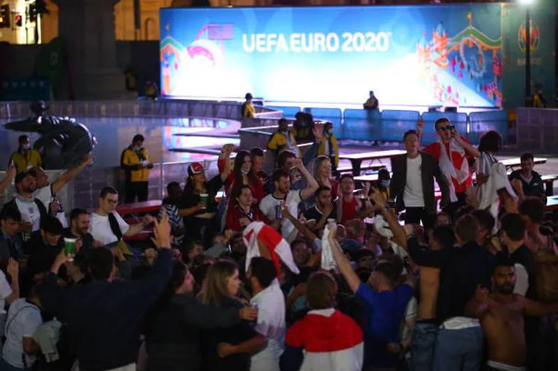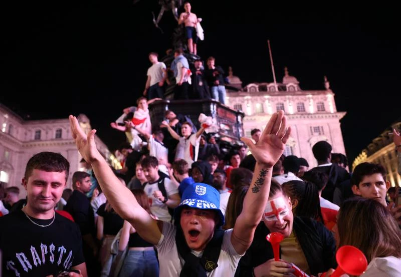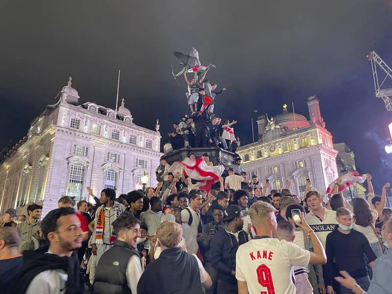 Đến thành La Mã xem Anh đá với Ukraina ở tứ kết Euro 2020, fan Anh quậy phá, leo lên tượng đài cao ở Piccadilli Circus.