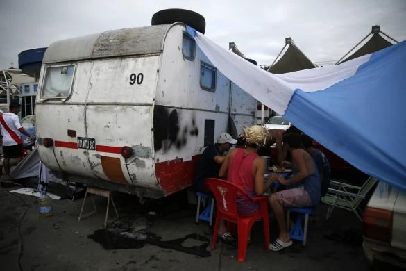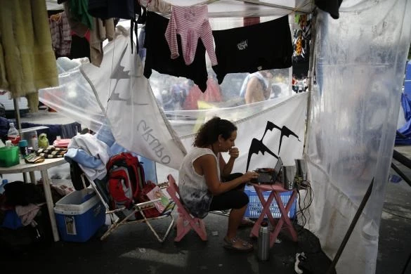 Một fan nữ lên mạng giải khuây trong lúc rảnh rỗi này. Cô tới Brazil bằng chiếc xe di động (tức motor home) của mình.