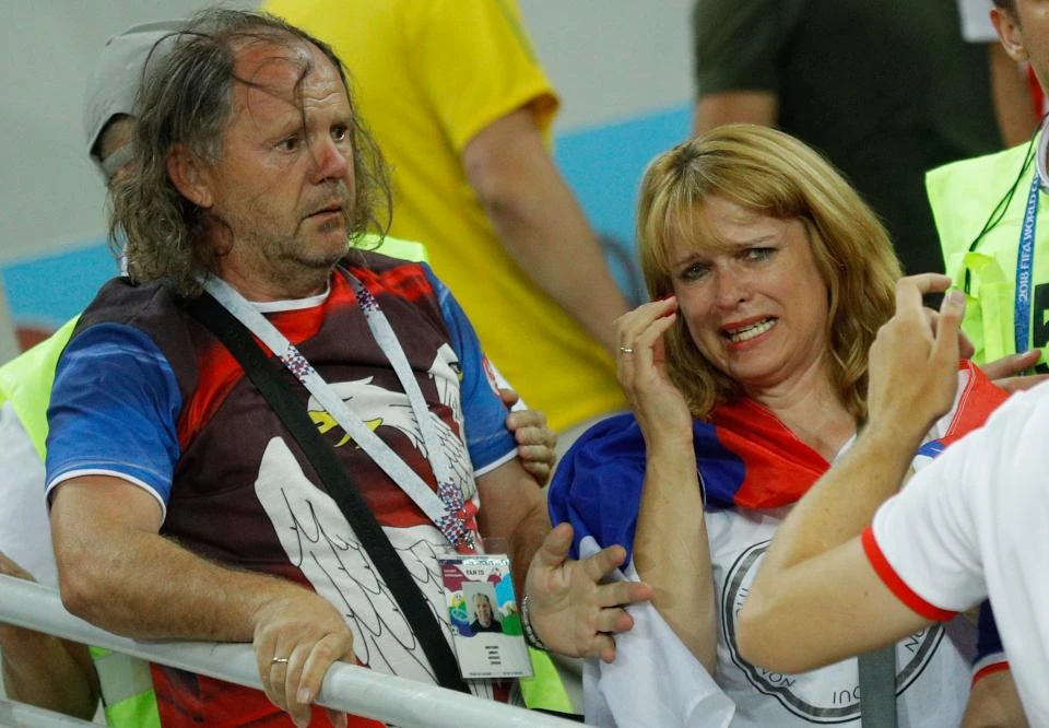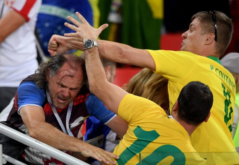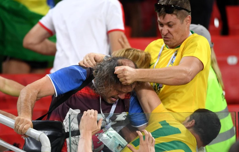Người phụ nữ bị kẹt trong cuộc ẩu đả giữa các cổ động viên nam của Brazil và Serbia...
