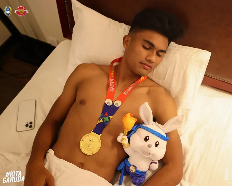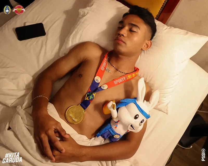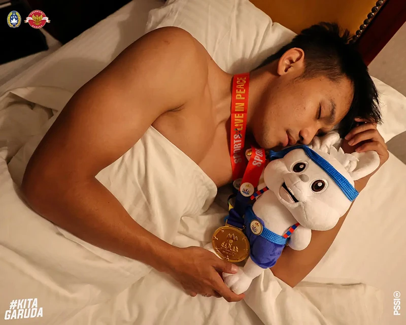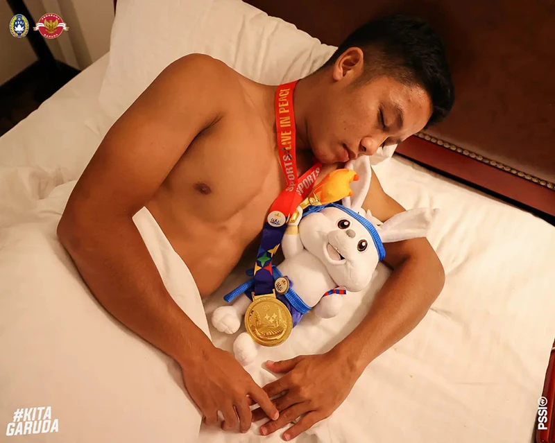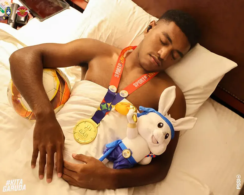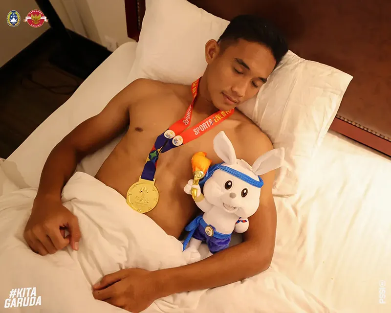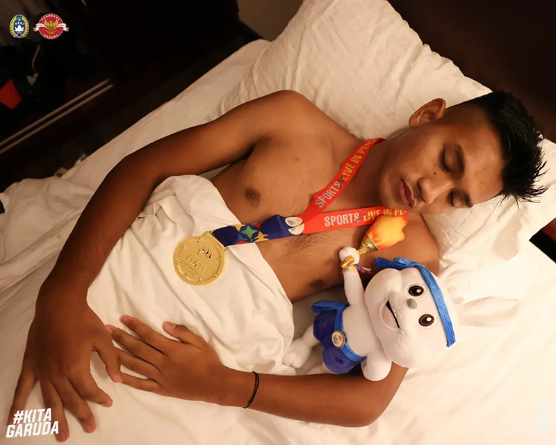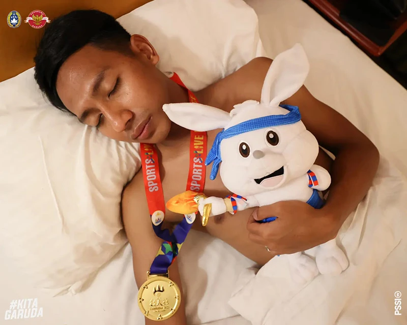 Khỏi phải nói, người hâm mộ và các cầu thủ của đất nước vạn đảo vui mừng như thế nào. Trong khi cổ động viên Indonesia đổ ra khắp các con phố “đi bão” ăn mừng, thì các ngôi sao làm nên niềm vui cho người dân đất nước lại có cách ăn mừng thầm lặng hơn nhưng cực kỳ chất và ấn tượng. Các cầu thủ Indonesia đã đem chiếc HCV và con "thỏ bông" linh vật SEA Games lên giường ngủ cùng.