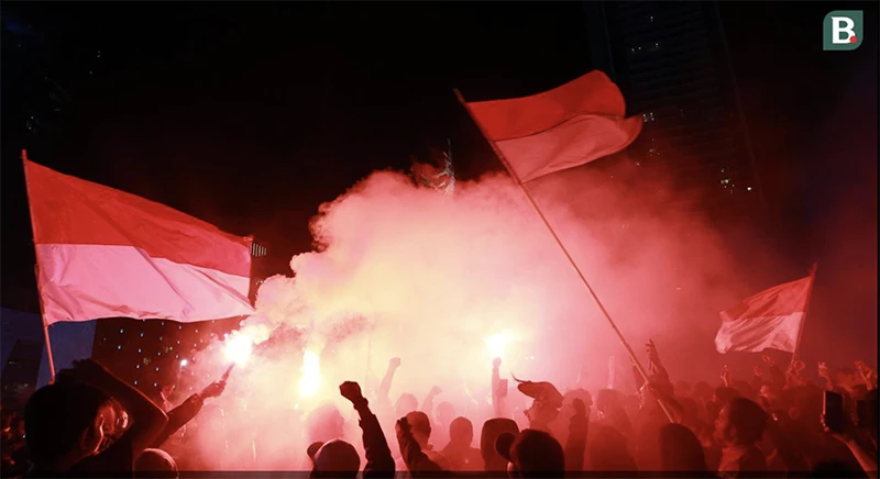 Hàng ngàn fan Indonesia tập trung tại Đài tưởng niệm Selamat Datang đốt pháo sáng ăn mừng. ẢNH: BOLA |